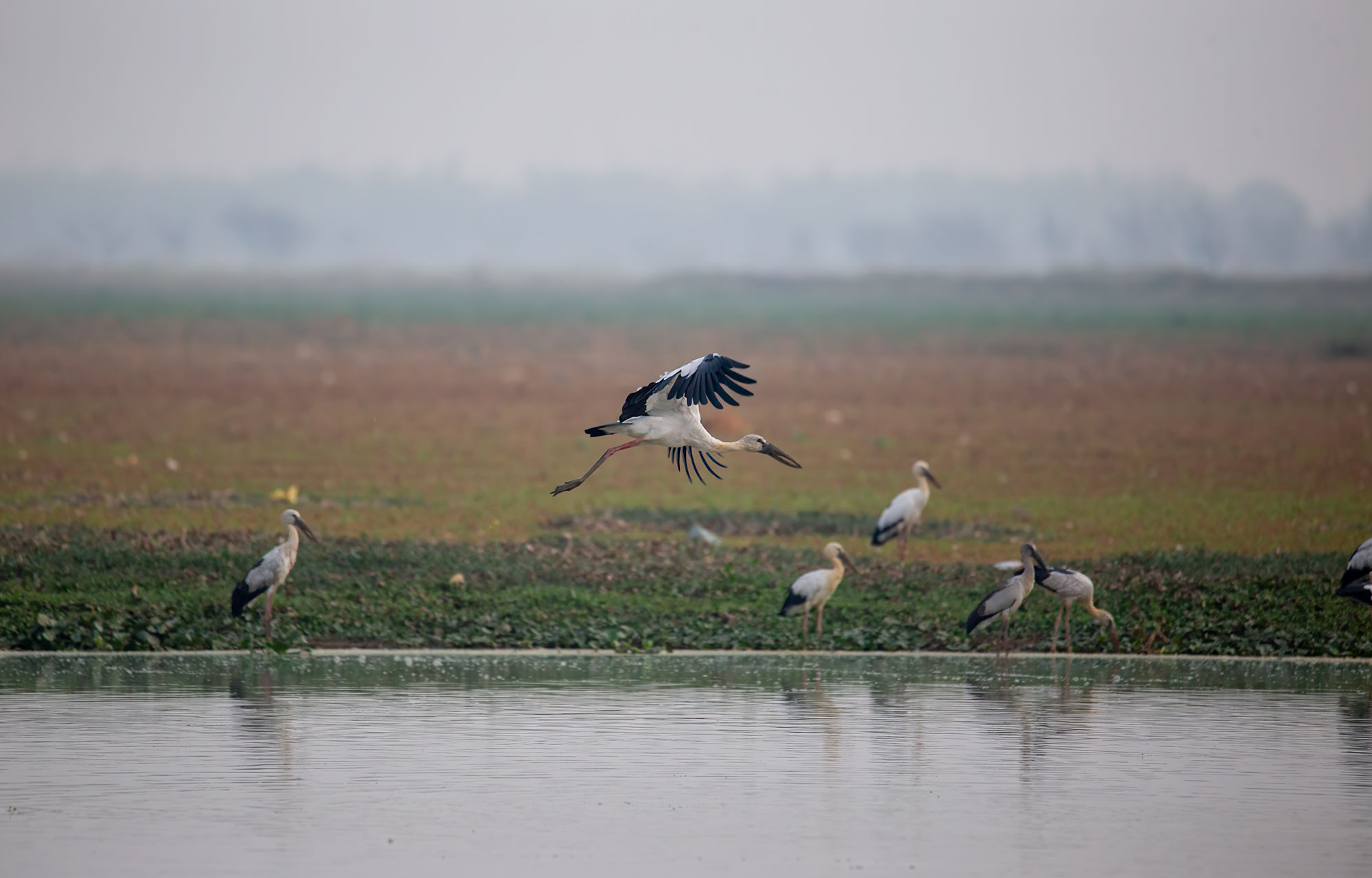 An Asian Openbill launches into the stillness, wide wings catching the haze.